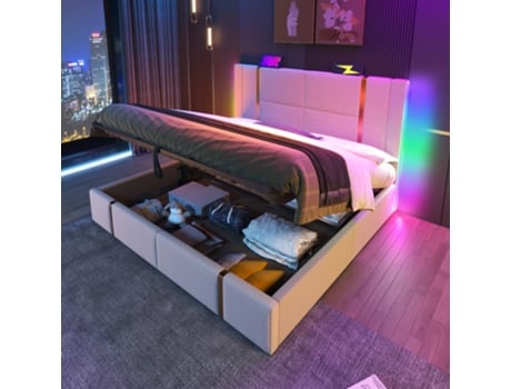 Cama Estofada Cama De Casal Usb Tipo C App-control Led 160×200 Camas De Arrumação Estrutura Da Cama, Roupa De Cama Bege Material Sem Colchão